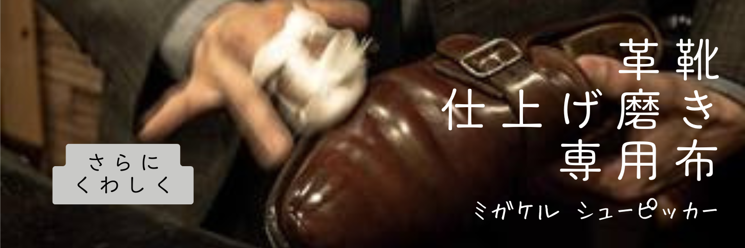 ミガケル・シューピッカーは、指に巻いて使う革靴仕上げ磨きクロスです。靴の美しい輝きを手軽に保ちます。