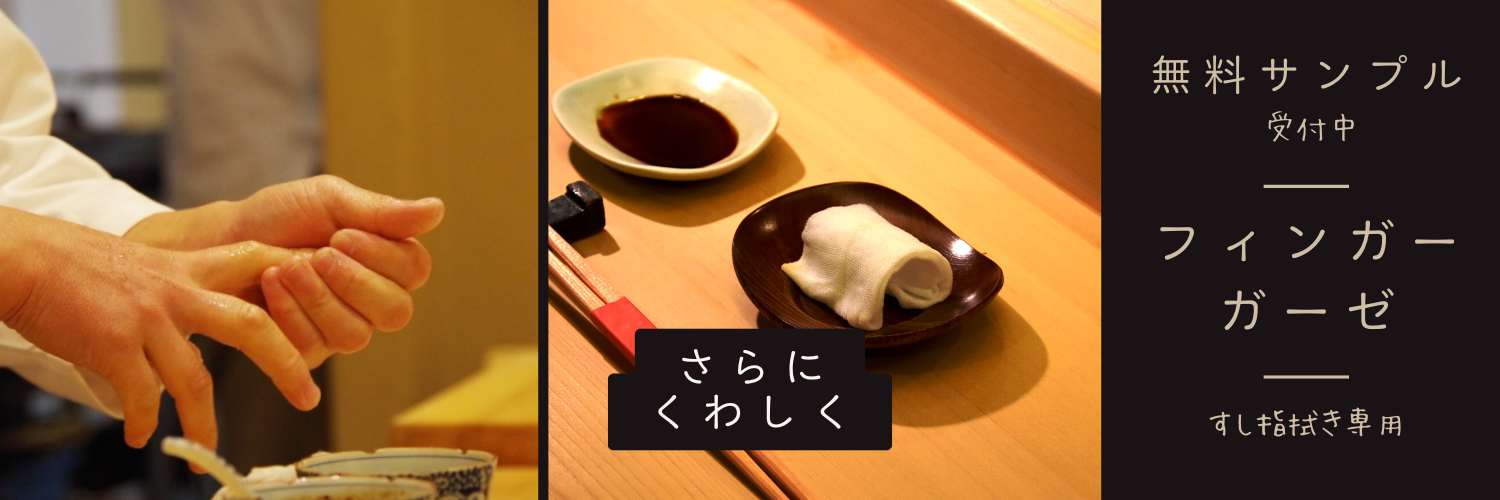 フィンガーガーゼは、鮨店のお客様指拭きに最適。繊細な指先と清潔な印象を演出します。